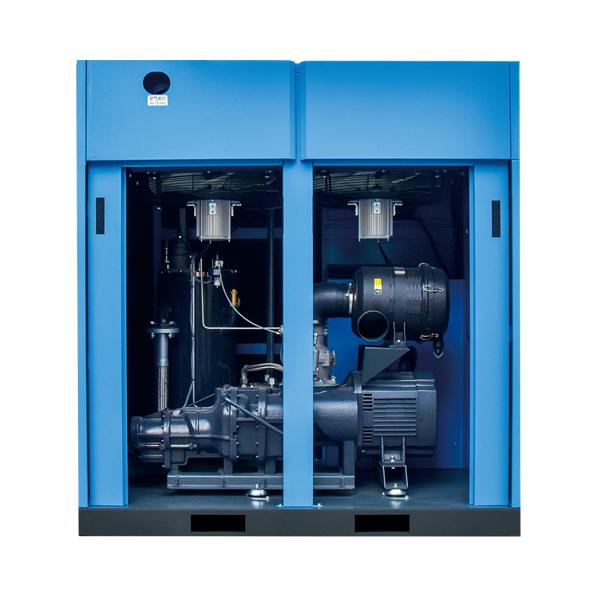 1、采用高能效水平双级主机,高效、低噪音、低振动、高可靠性,每级压缩比小,泄露更小,容积效率更高。相同功率下由两个机头承担负荷,轴承受力小,寿命更长。